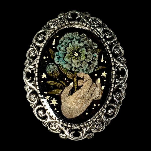 掌サイズのミニ原画を閉じ込めたブローチです。 〈原画作品〉 アンティーク紙にペン、鉛筆、透明水彩 レジンコーティング 原画サイズ:30×20mm パーツサイズ:40×30mm 台湾で買い付けたパーツを使用しています。 2025年制作 〈アンティーク紙について〉 バイヤーが直接買い付けてきた、ベルギーの片田舎の小さな協会で見つけた約130年以上前の1800〜1900'sアンティーク紙に描いております。 ※レジンコーティングはアンティーク紙の性質上、気泡が入りやすくなっております。 ※お使いのモニター画面や光源による実物との若干の色の違いが御座います。 ご了承下さいますようお願い致します。