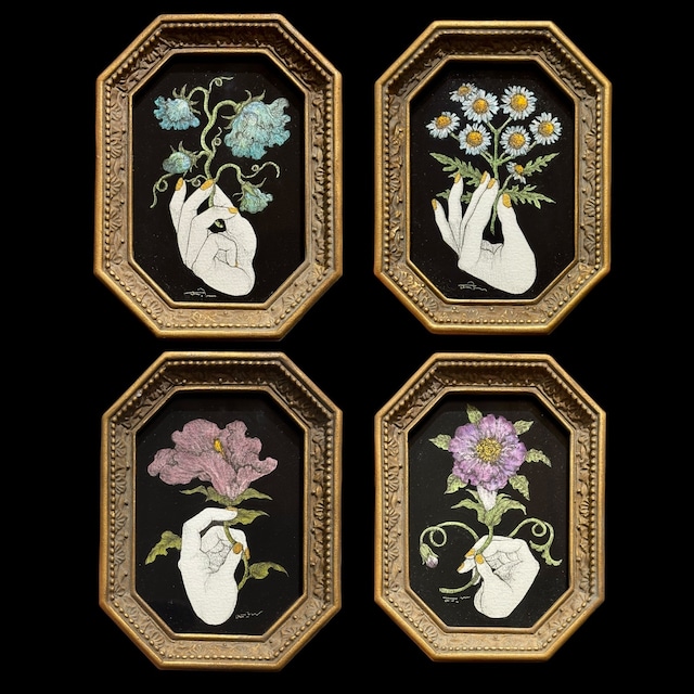 手の平サイズのミニ原画。 「小さな花をひとつまみ。」 〈原画作品〉 アンティーク紙にペン、鉛筆、透明水彩、アクリル 原画サイズ:60×85mm 額縁サイズ:80×105mm 壁掛け、立て掛け/ アクリル板 2025年制作 ※現行フレームを使用しています。 アンティーク風の加工の為、1点1点風合いが異なります。 ※お使いのモニター画面や光源による実物との若干の色の違いが御座います。 ご了承下さいますようお願い致します。