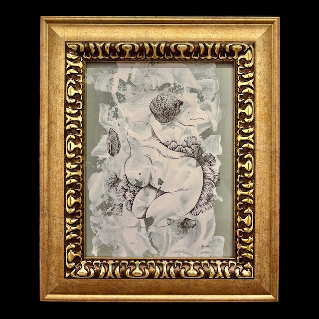 “Pensive” 2025年4月に開催した東京個展“drawing”の為に制作したシリーズ。 思考をなぞるように、無意識と有意識が混ざり合う中で生まれた作品群。 物思いに耽るように、静かに考えて広がる様を描いています。 タイトルを細かく設定していないのは、鑑賞者にとって空想する余白を作ることを目的としています。 〈原画作品〉 水彩紙にペン、鉛筆、顔彩 原画サイズ:180×140mm 額縁サイズ:250×205mm 壁掛けのみ / アクリル板 2025年制作 ※お使いのモニター画面や光源による実物との若干の色の違いが御座います。 ご了承下さいますようお願い致します。