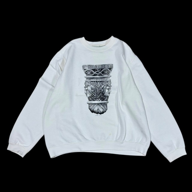 セレクトした古着に、1つ1つ作家本人がシルクスクリーンを行っています。 ※こちらのアイテムはヴィンテージ古着を使用しています。 古着ならではの、ダメージやフェード感が可愛いと感じたアイテムをセレクトしている物もある為、 古着がお好きな方、ダメージや使用感が気にならない方にお勧めいたします。 【ダメージについて】 フロント・腹部付近に薄らとシミ有り。 使用感、若干の毛羽立ち有り。 お色は、写真1枚目が近しいです。 【実寸】 着丈: 62cm 身幅: 57cm 裄丈: 76.5cm 【表記詳細】 1990's ヴィンテージ Hanes コットン 50% アクリル 50% アメリカ製 サイズ L 【注意事項】ご購入前に必ずご確認下さい。 ※ダメージ以外にも古着特有の使用感がある場合も御座います。 可能な限りお手入れをしておりますが、時代を越えて今の時代まで残ってきた古いもの達という事を予めご理解頂けますと幸いです。 ※採寸、検品、お手入れは、全て一点一点手作業にて行っている為、多少の採寸誤差や傷等の見逃しがある可能性があります。 サイズは誤差が生じる可能性がありますので、あくまでも目安として考えて頂きますようお願い致します。 ※お使いのモニター画面や光源による実物との若干の色の違いが御座います。 ご了承下さいますようお願い致します。